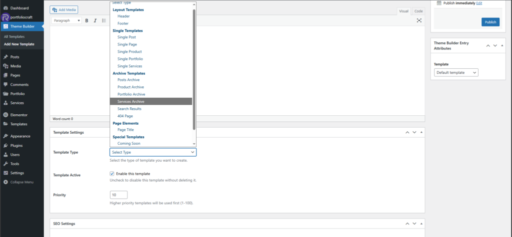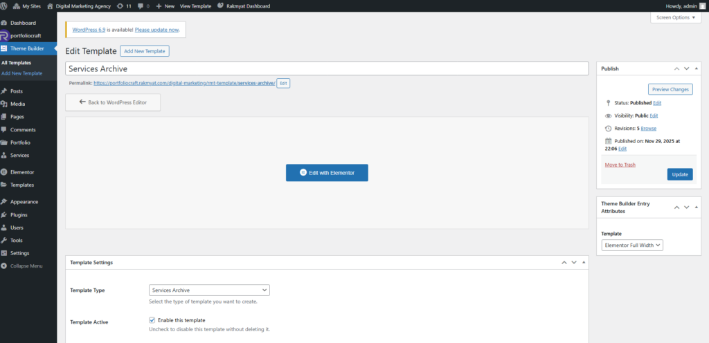 The Services archive page layout is handled by a Theme Builder template, same as Portfolio.