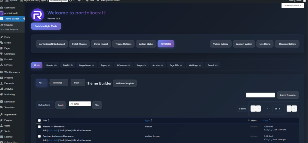 The footer in Rakmyat themes is managed with a Template Builder layout plus Theme Options and optional per‑page overrides.