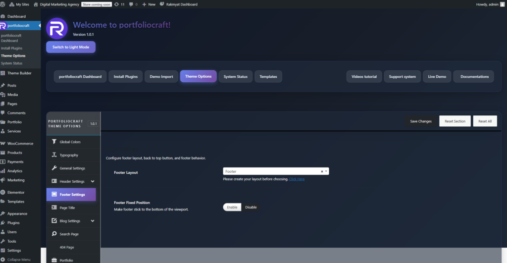 - Go to Rakmyat Dashboard → Theme Options → Footer Settings.