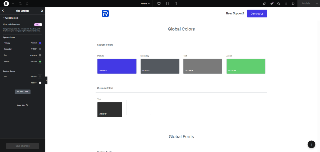 - After changing colors in Elementor → Site Settings, click Update/Save at the bottom of the Elementor panel.