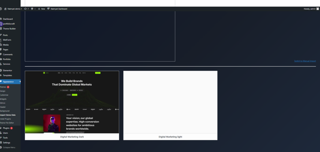 or Appearance → portfoliocraft → Demo Import (Rakmyat Core page).