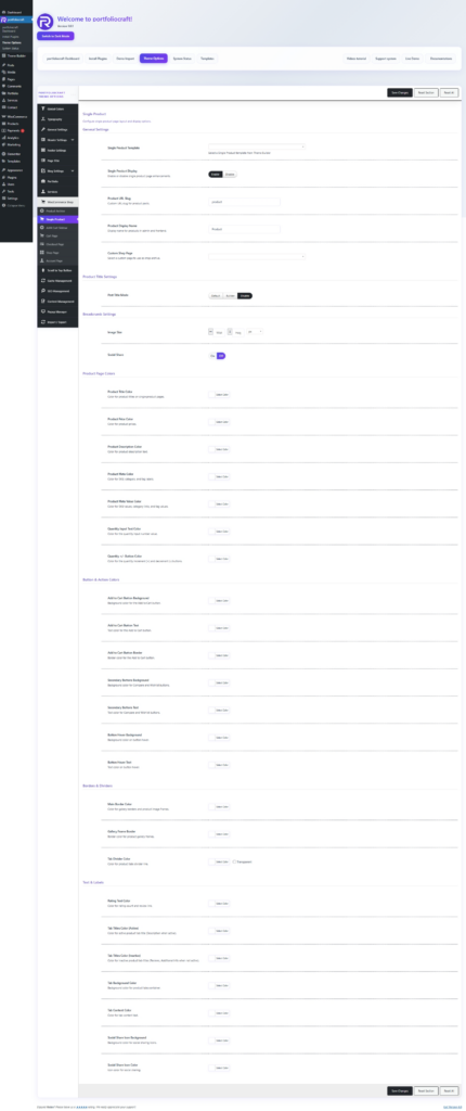The Single Product options control the layout, template, and styling of WooCommerce product pages in your theme. These settings let you choose a Theme Builder template and fine‑tune colors, texts, and buttons for all products at once.
