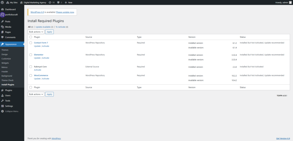 Follow these steps to install your Rakmyat Theme and required plugins including the essential Rakmyat Core plugin.